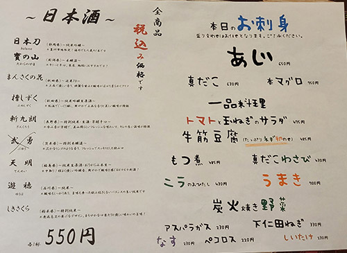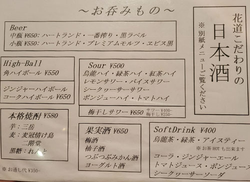 「花道」という店名や外からの印象で「昔ながらの元気なオヤジ(花道)がやっている賑やかな大衆居酒屋」を想像していたら、入ってびっくり!こじゃれた古民家風の日本酒バー。