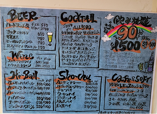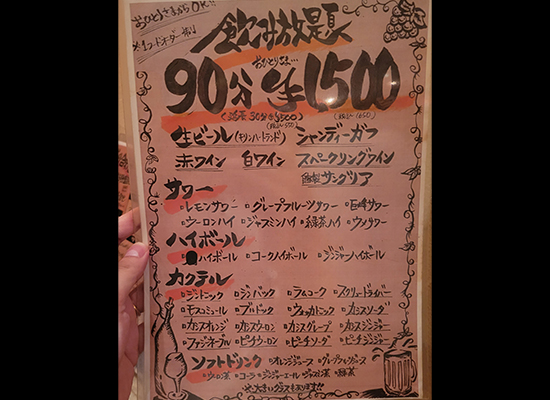 90分1500円の飲み放題でスパークリングワイン、ビール、サングリアなどドリンクの種類も豊富。飲み放題は30分500円単位で延長ができるのも嬉しい。